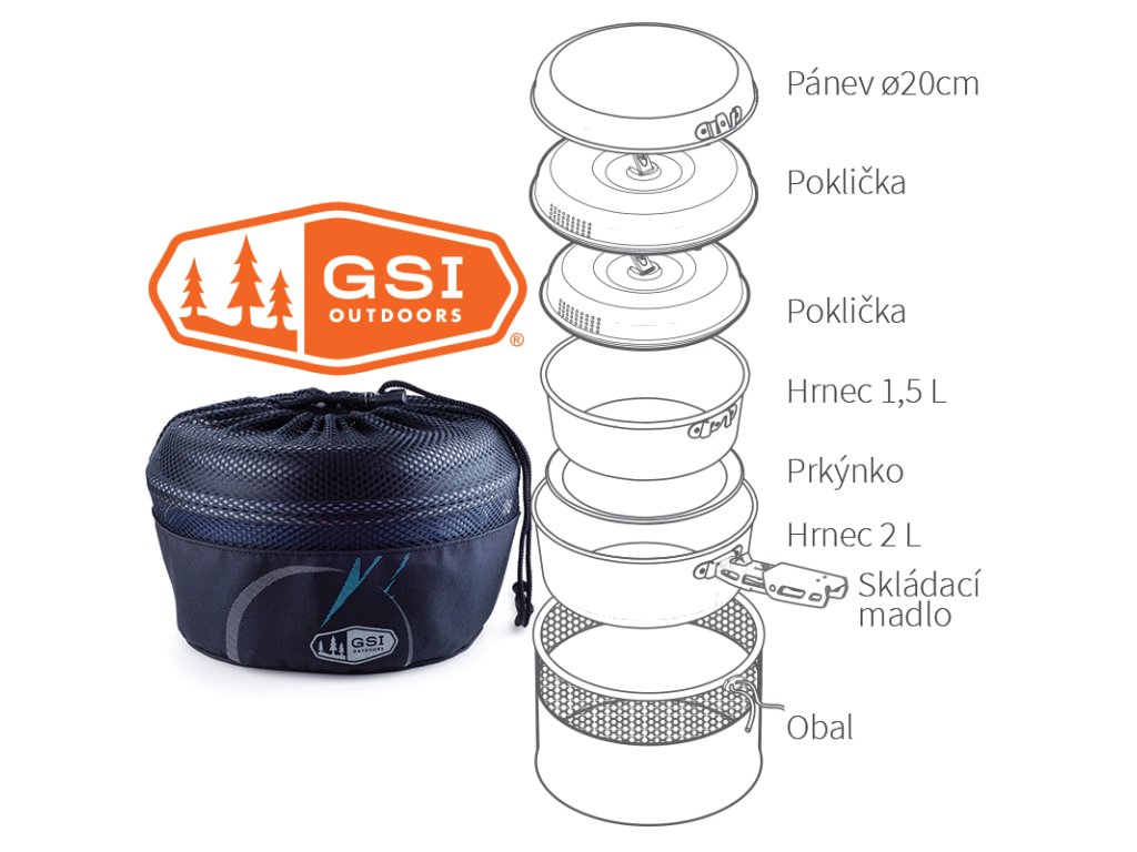Sada nádobí s teflonovým povrchem pro 2 osoby. Na vnější straně je použita vysokoteplotně tvrzená barva, která chrání hliníkové jádro proti odéru a oxidaci. Zároveň dává nádobí lesklou povrchovou úpravu. Sada obsahuje 2 hrnce, pokličky, pánvičky, prkénka a obal, který můžete použít jako umyvadlo. Povrch je chráněn úpravou Bugaboo.Perforovaná poklička z BPA-free plastu umožnuje bezproblémový únik par z hrnce a zároveň slouží jako sítko například pro slití vody z těstovin.Pohodlná skládací odnímatelná rukojeť zpříjemní vaše vaření.Pánev může také sloužit jako poklička.Plastové prkénko na dně kastrolu zabraňuje poškrábání povrchu hrnců.