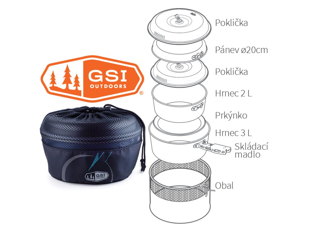 Sada 2 kastrolů a dalšího vybavení pro kempování 3 osob. Povrch hrnců je chráněn úpravou Bugaboo. Perforovaná poklička z BPA-free plastu umožňuje bezproblémový únik par z hrnce a zároveň slouží jako sítko například pro slití vody z těstovin. Navíc má poklička na vršku silikonovou úchopku pro jednoduchou a bezpečnou manipulaci. Součástí výbavy je i pohodlná skládací rukojeť, která se dá jednoduše připnout k jednotlivým hrncům. Sestava nádobí nabízí několik drobných, ale důležitých vychytávek jako třeba pánev, která se dá použít jako poklička nebo plastové krájecí prkénko na dně kastrolu, které zabraňuje poškrábání povrchu hrnců.