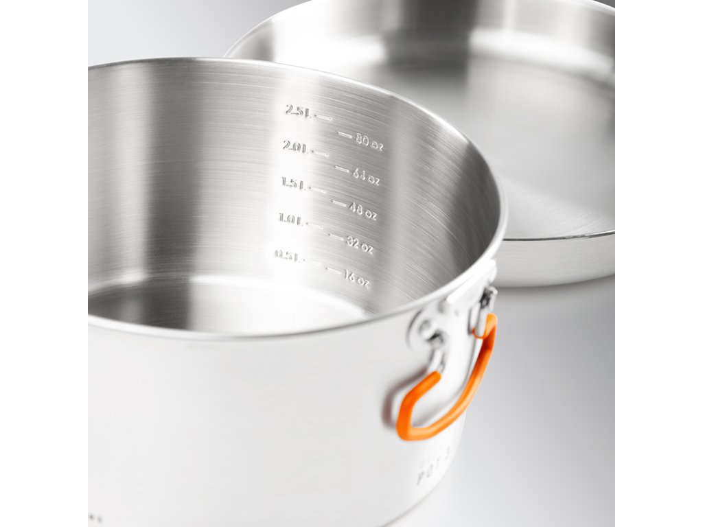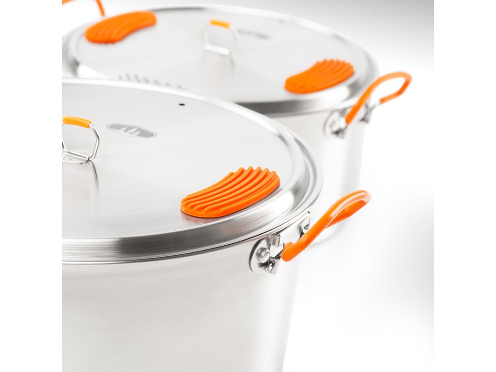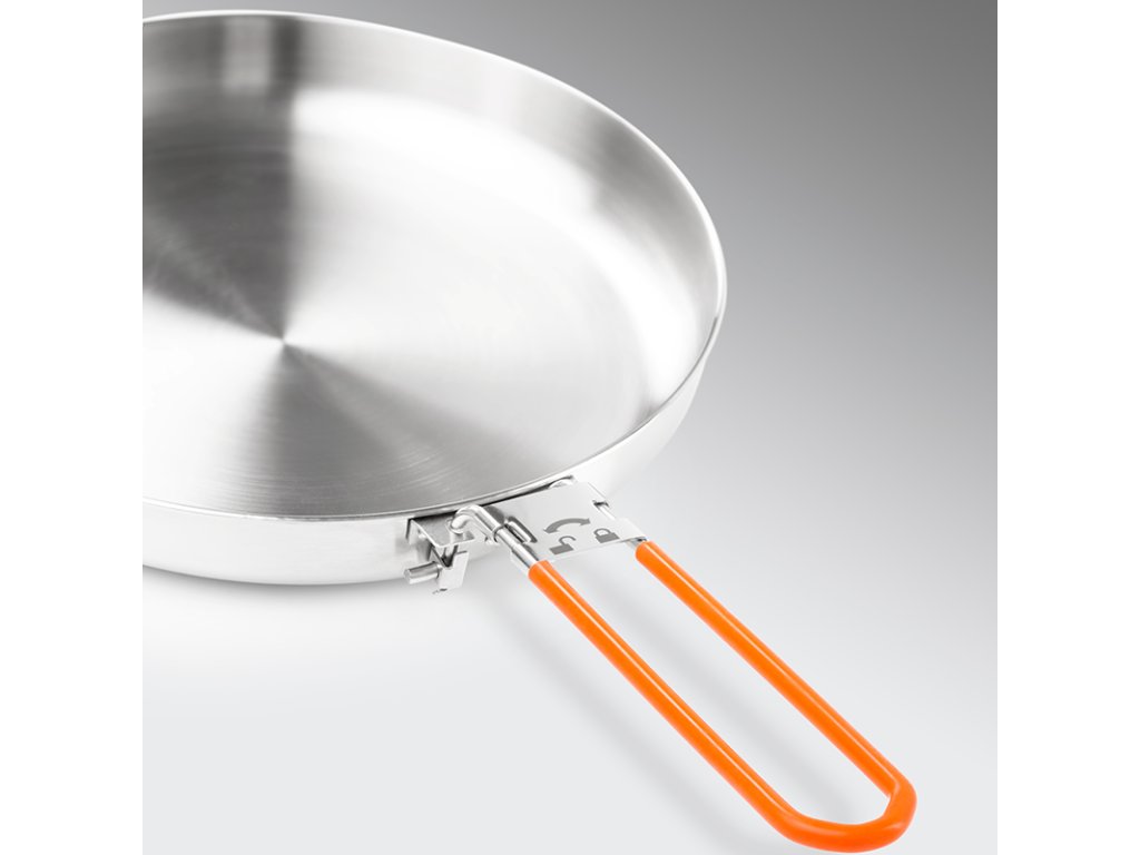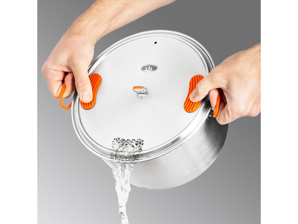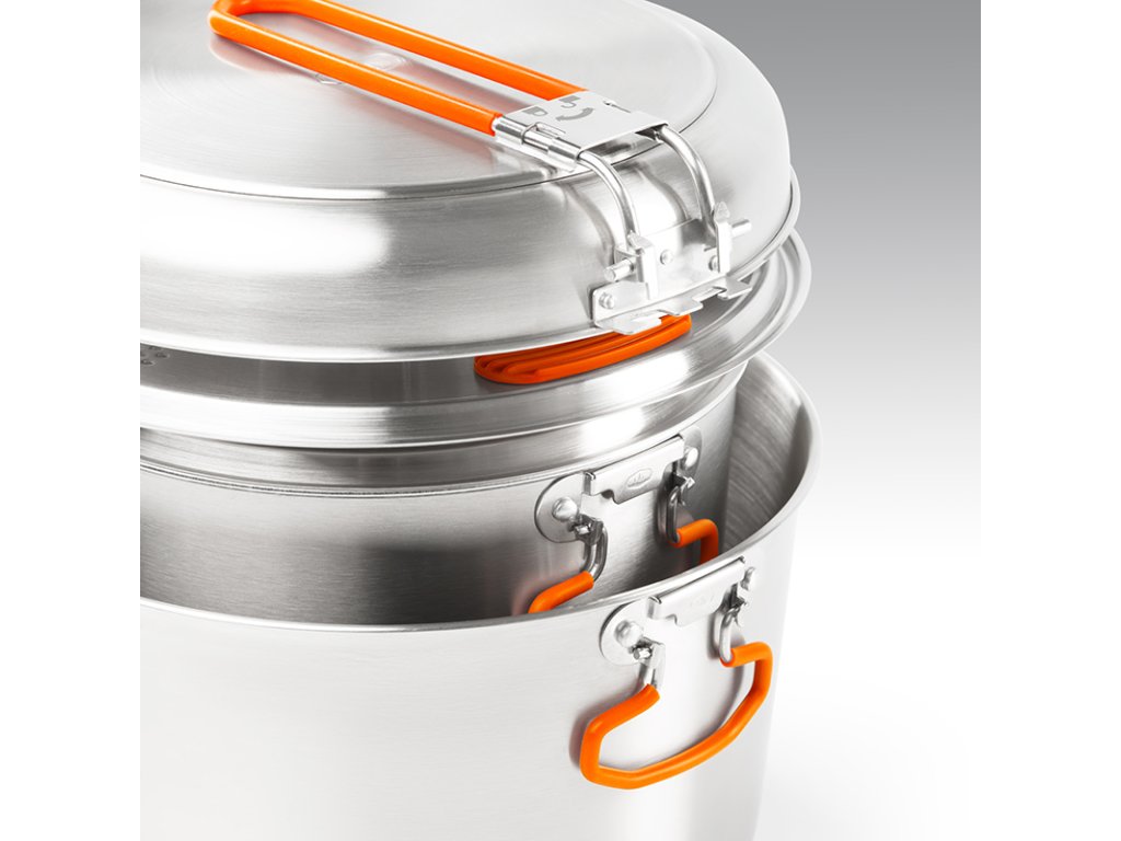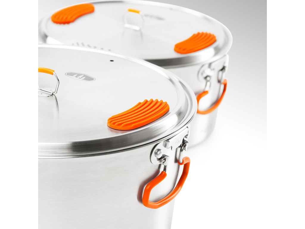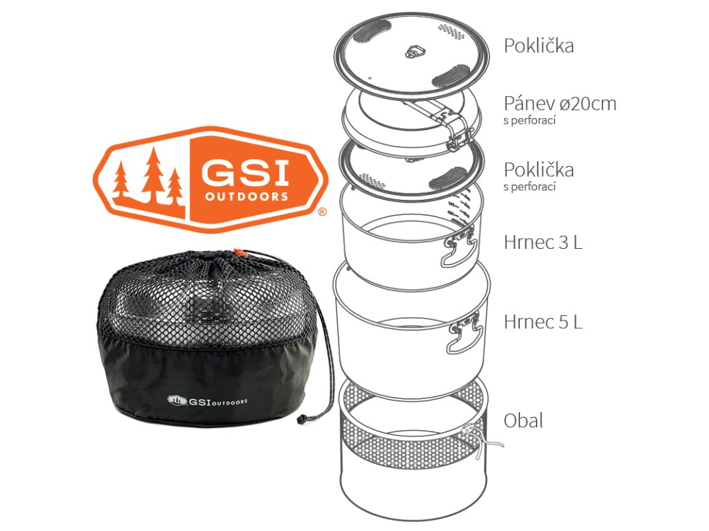 Kempovací nerezová sada 2 hrnců 3L + 5L a pánve pro 4 a více osob. Perforované pokličky umožňují bezproblémový únik par z hrnce a zároveň slouží jako sítko například pro slití vody z těstovin. Navíc má poklička silikonové chrániče na palce pro jednoduchou a bezpečnou manipulaci. Sada nádobí GSI Glacier Base Camper Large je vyrobena z prvotřídní odolné nerezové oceli.