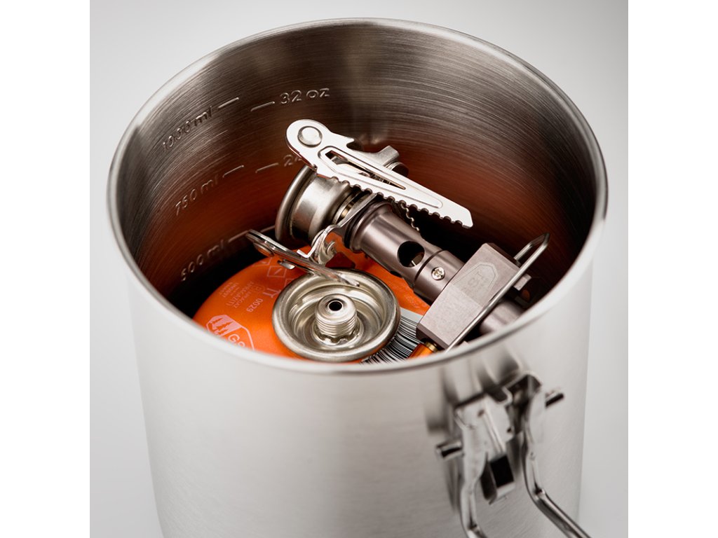 Velmi odolný, lehký kompaktní nerezový kotlík na vaření se skládací rukojetí. Do kotlíku lze pro úsporu místa umístit i malou plynovou kartuši (110g nebo 230g) se skládacím vařičem (nejsou součástí balení).