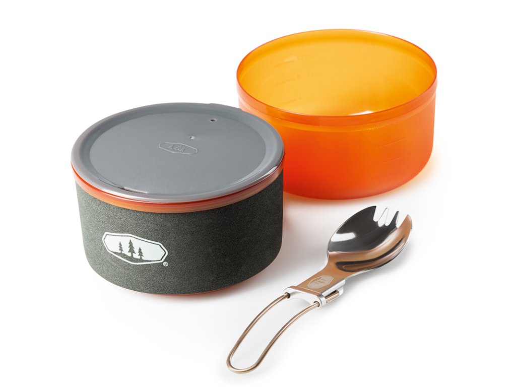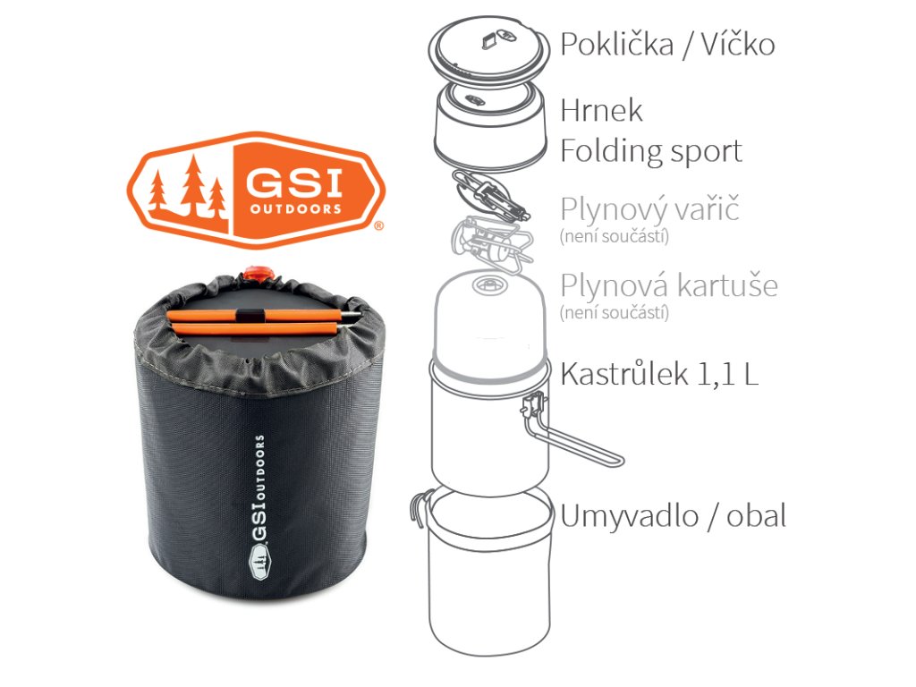 Kompaktní sada nádobí pro jednu osobu s hlavním 1,1l rendlíkem z tvrdě eloxovaného hliníku. Součástí sady je miska, hrnek s děrovaným víkem pro pití, skládací nerezová lžícovidlička, perforovaná poklička pro scezení vody a obal na celou sadu, který slouží jako nádoba na vodu nebo umyvadlo. Celá sada se dá do hlavního rendlíku složit tak šikovně, že zbyde místo i pro plynovou kartuši GSI Isobutane Fuel 230g a plynový vařič GSI Pinnacle Canister Stove, které však nejsou součástí sady.