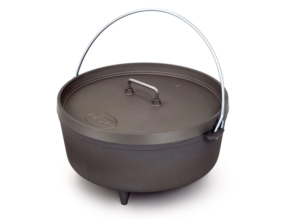 Ultra odolná hliníková holandská trouba do ohně s dokonalým rozvodem tepla. Tvrdě eloxovaná konstrukce kotlíku váží o celých 66% méně než litina, je velmi odolná proti poškrábání. Poklice má hlubší zapuštění, aby na ní snadno držely žhavé uhlíky. Holandské trouby od GSI Outdoors jsou navrženy tak aby 10" pohodlně zapadla do 12". Holandskou troubu je možné zapustit do žhavých uhlíků nebo jí lze použít jako zavěšený kotlík nad oheň.