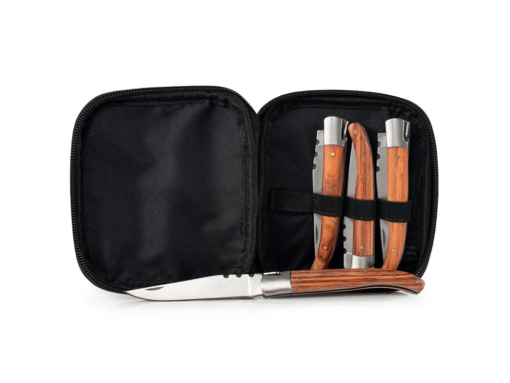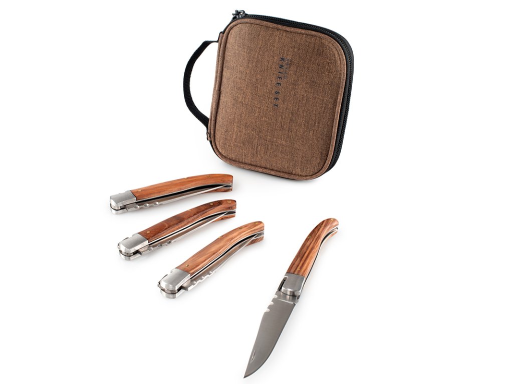 Sada 4 steakových zavíracích nožů Folding Steak Knife je dalším produktem z kolekce Rakau americké značky GSI Outdoors. Ostří nožů je vyrobeno z prvotřídní nerezové oceli, která vyniká výjimečnou tvrdostí a kvalitou. Tvarovaná střenka každého z nožů je stejně jako ostatní produkty rodiny Rakau vyrobena z recyklovaného dřeva, které je jednak příjemné na pohmat, ale hlavně v ruce neklouže. Celá sada je uložena v přepravním obalu z recyklovaného PET