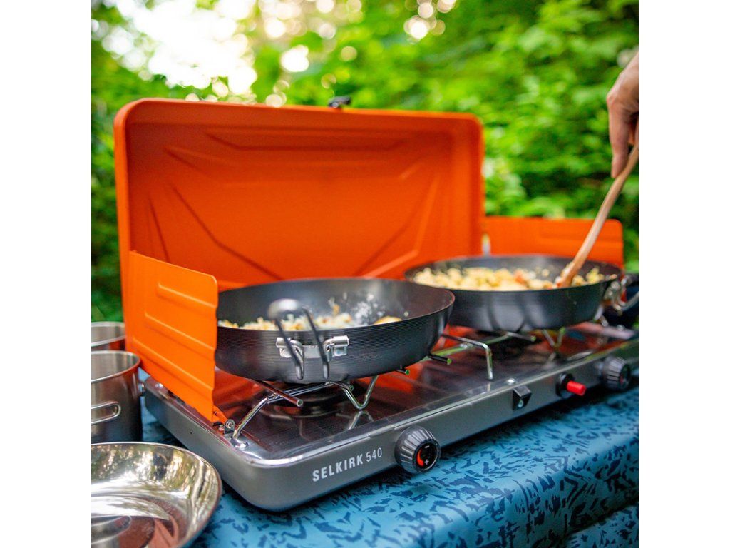 Ve výbavě máte totiž profesionální venkovní vařič GSI Outdoors Selkirk 540i se dvěma samostatně regulovatelnými hořáky o výkonu 12000 BTU/h (3,5kW/h). Nejtěžší je rozhodnout se co uvařit, protože možnosti Selkirku 540i jsou obrovské. Na hořáky můžete umístit 2 pánve nebo hrnce o průměru až 25 cm. Sestavení vařiče je velice snadné a rychlé. Po připojení plynové kartuše (například GSI Isobutane Fuel 450g) už stačí jenom vybraný hořák zažehnout pomocí piezo tlačítka. Rozpálená pánev se šťavnatým masem bezpečně drží na masivním nerezovém roštu a i když kolem řeky proudící vítr příjemně ochlazuje, teplo vařiče drží na svém místě díky bočním windshieldům.