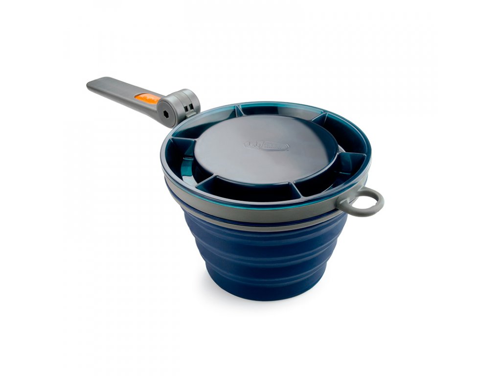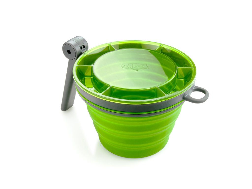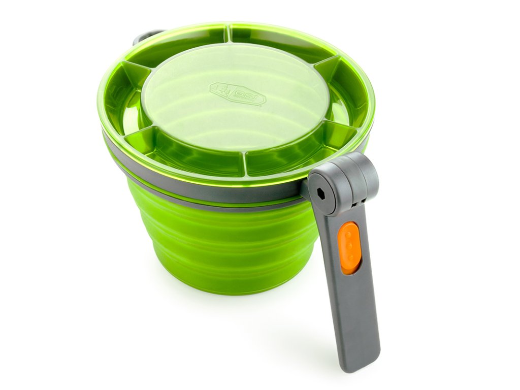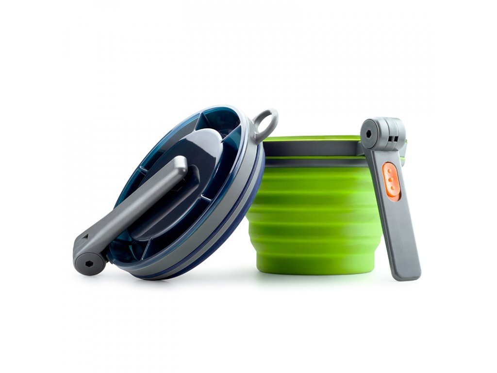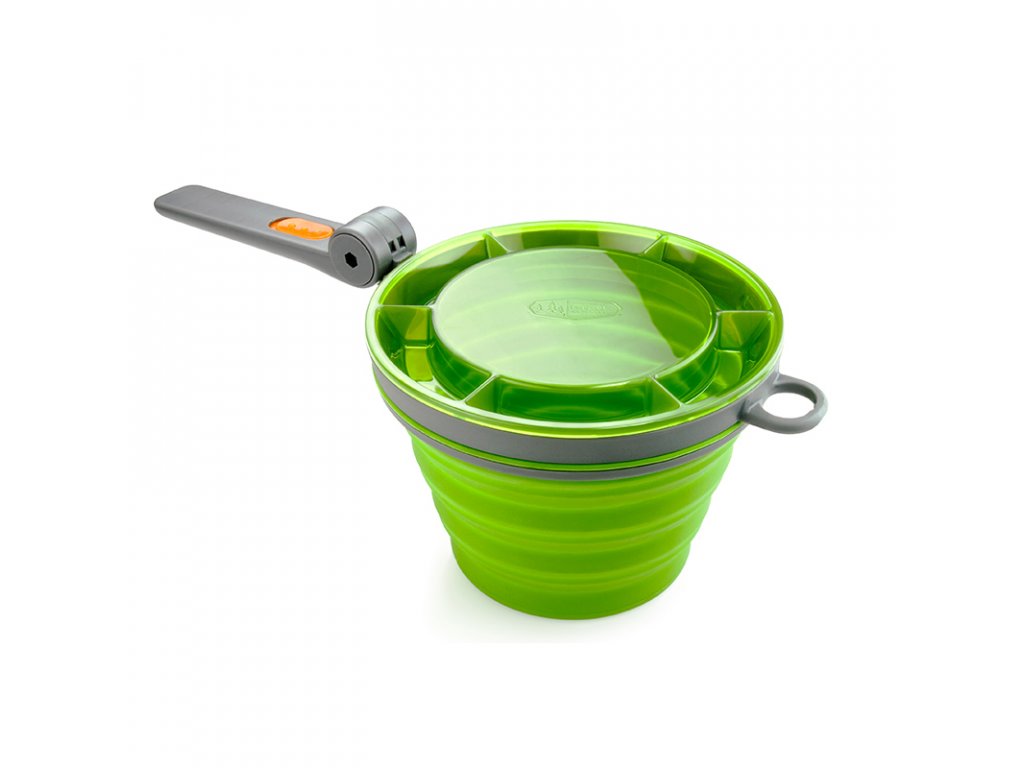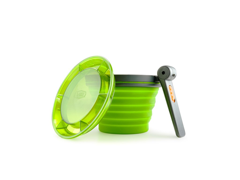 Praktický hrnek s vychytanou integrovanou skládací rukojetí se zámkem pro fixaci ve dvou různých polohách. Horizontální pro lepší manipulaci při jídle, a diagonálně-vertikální pro manipulaci při pití. Složený silikonový hrnek má výšku pouhých 43mm, Hrnek lze rozložit až do objemu 680ml. Víčko z Infinity clear Polypropylenu perfektně zapadá do horního lemu hrnku a dokonale izoluje obsah před okolními vlivy a chrání před vylitím.