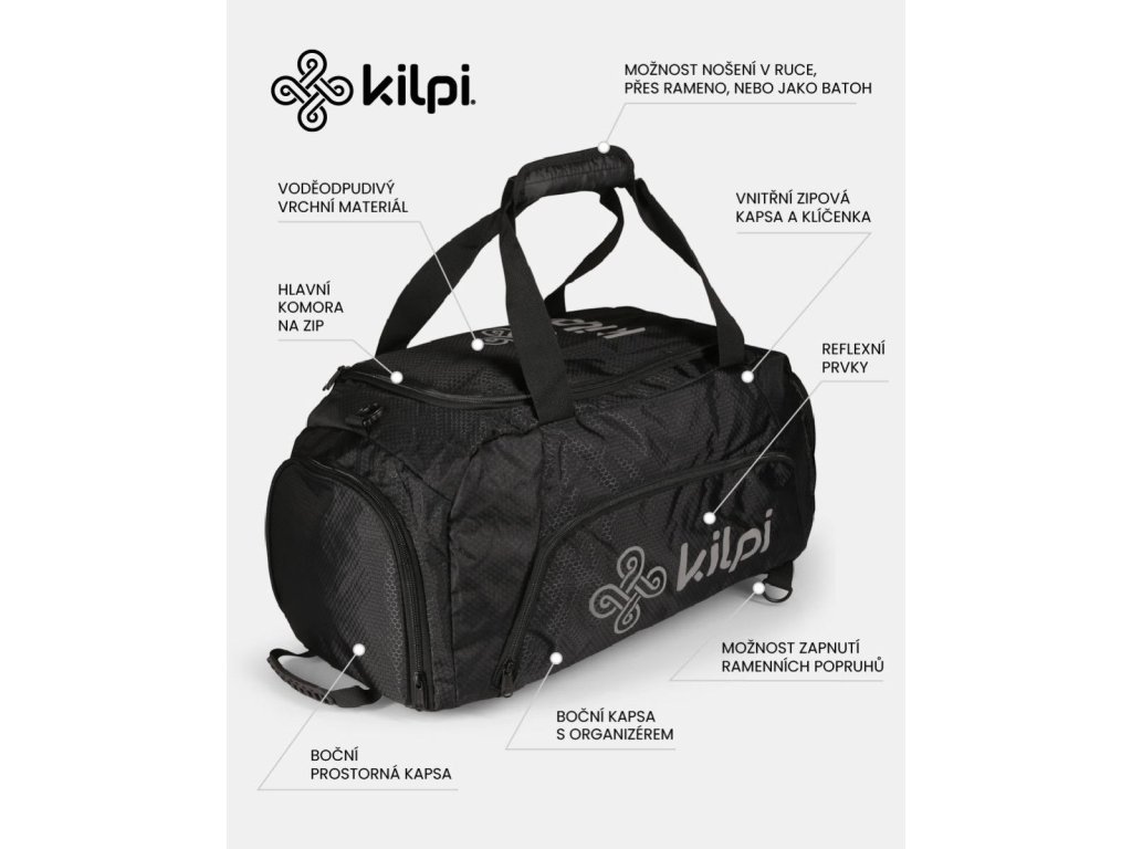 Fitness taška Kilpi DRILL 35-U nabízí prostorný objem 35 litrů. Tak snadno zabalíte vše potřebné do fitness centra, na trénink nebo na kratší dovolenou. Taška nabízí pohodlný přístup do hlavní komory, díky velkému "víku" na zip. Uvnitř je malá zipová kapsa na drobnosti a klíčenka v síťované kapse. Určitě oceníte extra oddělenou přihrádku na tenisky nebo vlhký ručník, 2 vnější zipové kapsy na mobil či peněženku, pohodlný nastavitelný ramenný popruh, nebo krátké popruhy pro nošení tašky v ruce. Taška DRILL-U je vybavena integrovanými schovanými popruhy ve dně, díky kterým lze během chvilky tašku nosit také jako batoh na zádech. Materiál tašky je dostatečně pevný, odolný a laminovaný, odolá vhlkosti a dobře se udržuje. Velká loga jsou reflexní a dobře viditelné ve tmě. Hmotnost tašky je 840g a rozměry dna jsou 55cm x 25cm.Doplňkové parametry