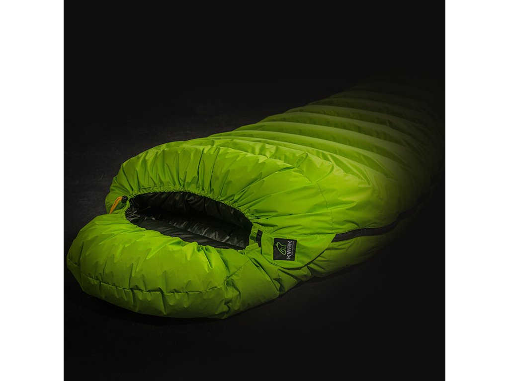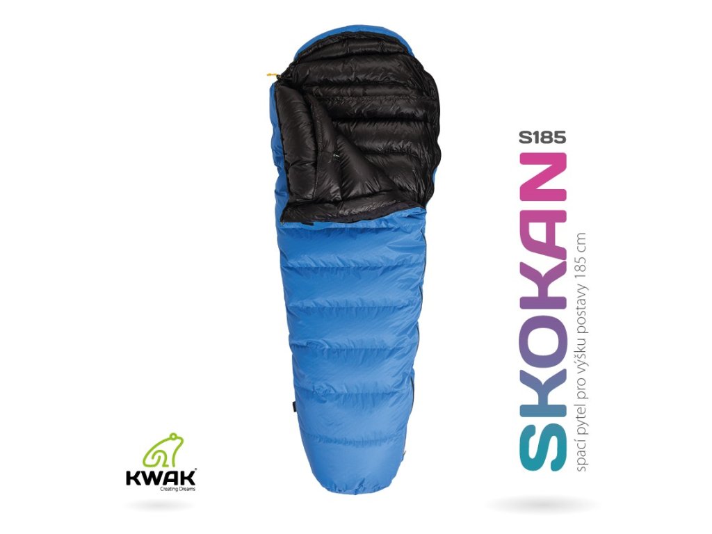 Střihy spacího pytle KWAK jsou anatomicky tvarované, v případě spacího pytle Skokan hovoříme o tzv. otevřené mumii. Součástí každého spacího pytle je kapuce na stahování, která dokonale ochrání hlavu a obličej před chladem. Navíc je ve standardní nabídce i čelní kšilt, který je umístěn shora našeho obličeje, a tak ještě více minimalizuje velikost obličejového prostoru a vytvoří Vám tak bezpečný prostor. Pro stahování bradové a záhlavní části kapuce jsou použity barevně odlišné šňůrky pro snadnou identifikaci a manipulaci s nimi. Uvnitř spacího pytle je umístěn buď 3D límec, plněný husím prachovým peřím, nebo 2D límec, bez výplně, jenž odděluje prostor pro hlavu od prostoru pro tělo. Obvod límce se uzavře zapínáním na velmi kvalitní a odolné suché zipy. Samosvorky KWAK poté umožňují regulaci obvodu límce a kapuce jednou nebo dvěma rukama. Hlavní oboustranný zip umožňuje rozepínání spacáku shora i zdola (otvor pro větrání nohou). Můžete si také vybrat zip ve tvaru "J", který přesahuje patovou část spacího pytle o 5 cm a umožňuje tak jeho úplné rozevření. Proto je možné ho následně využít i jako deku (dekáč)