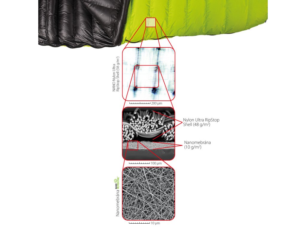 Vnější materiál spacího pytle KWAK s nanotechnologií NANO nylon Ultra RipStop Shell 58 g/m2 má vynikající technické parametry viz Nanovlákenná membrána. Tkanina je větruodolná, prodyšná i voděodolná. To je základní podmínka pro dobrou funkčnost izolačního materiálu. Jakmile by peří navlhlo, ztratilo by svoji tepelnou funkčnost. Vnější tkanina má bezpečnostní a pevnostní ochranu zvanou RipStop. Princip ripstopových tkanin spočívá v tom, že do tenké textilie jsou zatkány silnější osnovní nebo i útkové nitě s odstupem 1-5 mm. Jakmile by se tkanina na určitém místě natrhla či narušila, zesílená nit trhlinu zarazí a nedojde tak k dalšímu poškození.