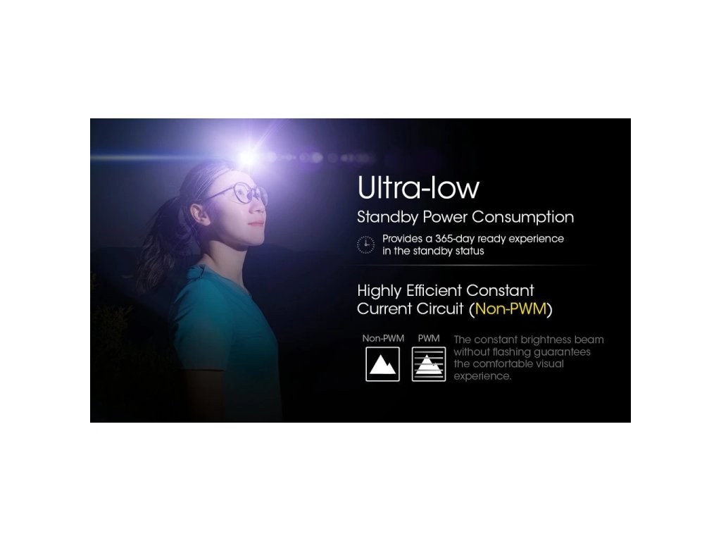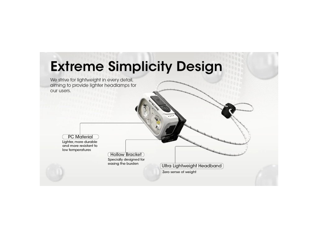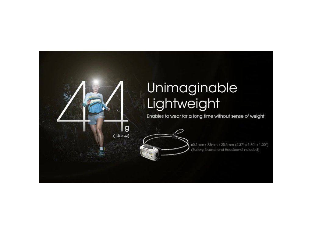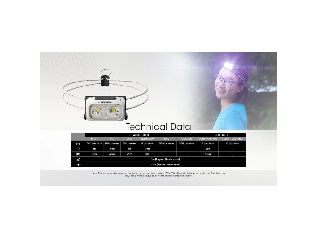 Lehká a výkonná LED čelová svítilna s maximálním světelným výkonem světelného toku 360 lumenů, intenzitou světelného kuželu 840 candela a dlouhou dobou svícení až 38 hodin na jedno nabití. Tato čelovka disponuje dvěma reflektory. Jeden slouží pro mód bodového dalekého dosvitu s názvem Spotlight. Tento světelný mód je vhodný pro nasvícení vzdáleného cíle. Druhý reflektor Floodlight slouží k nasvícení blízkého okolí za pomocí širokého kuželu světla bez zřetelného středového bodu. Úhel světla v tomto módu je vysokých 100°. Tyto dva módy Spotlight a Floodlight se kombinují pro dosažení optimálního světelného kužele pro nejrůznější potřeby a aktivity. Dosvit čelovky v této kombinaci je 58 metrů. Dále je čelovka opatřena 2 diodami červeného světla. Červená lze používat jak v módu stálého svitu, nebo výstražného blikání. Červená barva je dobrá pro jemný přísvit, protože nerozostřuje vidění a lidský zrak si rychle zvykne zpět na tmu když čelovku zhasnete. NU21 je ovládaná dvěma spínači. Při stisku obou tlačítek naráz dojde k uzamčení tlačítek čelové svítilny. To je vhodná doplňková funkce pro cestování s čelovkou v zavazadlovém prostoru. Nedojde tak k nechtěnému zapnutí a vysvícení čelovky. Jako další novinka u nové NU21 je i integrovaný indikátor stavu nabitosti akumulátoru. Provázkový popruh pro rychlý únik potu je opatřen reflexními bezpečnostními prvky a rychloodepínací držák svítilny z popruhu slouží pro snadné očištění čelovky. To jsou jen další výhody, proč si zvolit pro Váše noční aktivity právě tuto čelovku. Vhodná pro vyznavače nízké váhy a vysokého výkonu. Nabíjení pomocí USB-C konektoru. Velice nízká hmotnost pouze 44g. Baterie Li-ion nabídne více než 500 cyklů nabití.