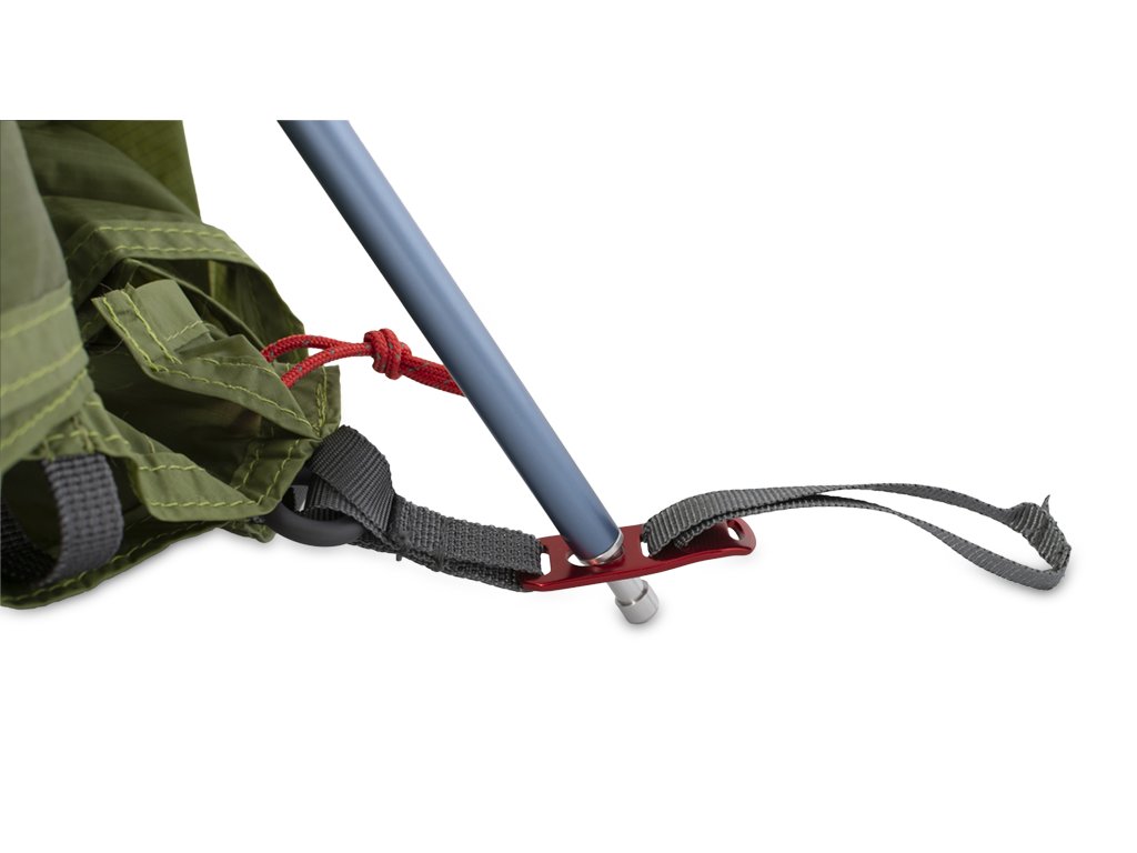Vnitřní stan zavěsíme háčky na duralovou konstrukci. Tropiko přetáhneme přes konstrukci, poté přichytíme suché zipy na spodní straně tropika k prutům. Sepneme spony a tropiko vypneme. Stan ukotvíme kolíky a šňůrami.