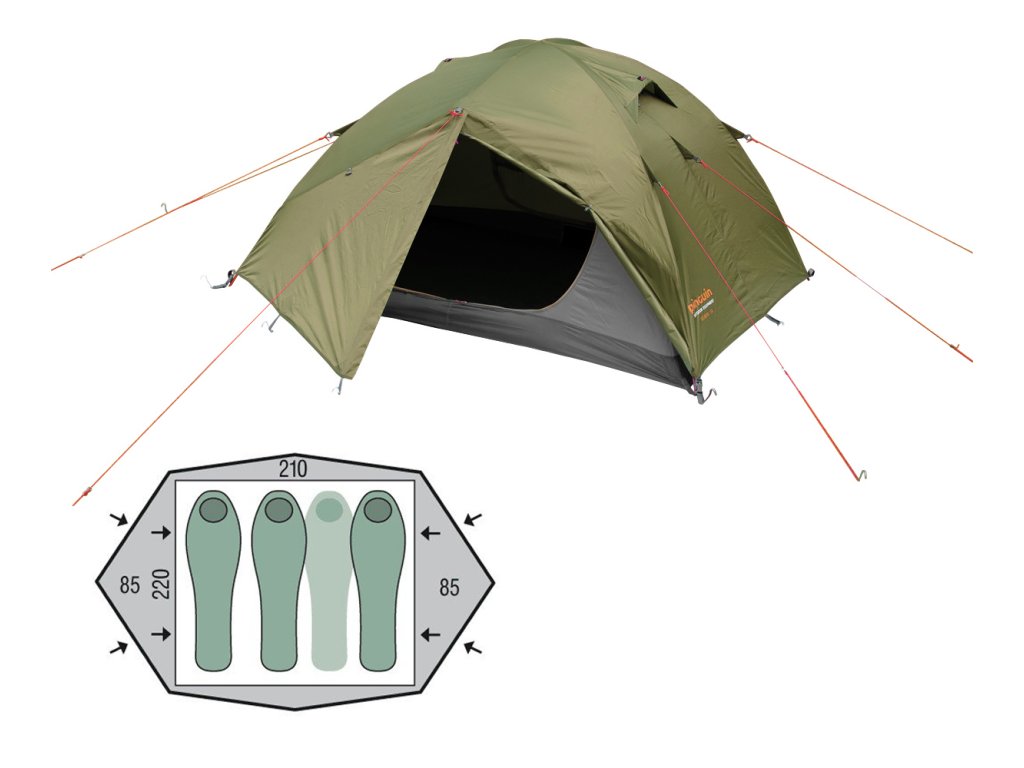 Léty prověřený model s dvěma vchody a předsíňkami, s osvědčenou konstrukcí s příčným vrcholovým prutem. Poskytuje dostatek prostoru a komfort vlastního vchodu nocležníkům na obou stranách ložnice. Tuhost konstrukce předurčuje stan k použití i v náročných podmínkách. Tropiko je vyrobeno z Polyesteru s polyuretanovým zátěrem, zaručujícím vodní sloupec o výšce 4 000mm. Švy jsou podlepeny vodotěsnou páskou. Podlážka je vyrobena z Nylonu s Polyuretanovým zátěrem, poskytujícím 10 000mm vodního sloupce. Pruty se skládají z duralových segmentů (7001 T6) o průměru 9,5mm.