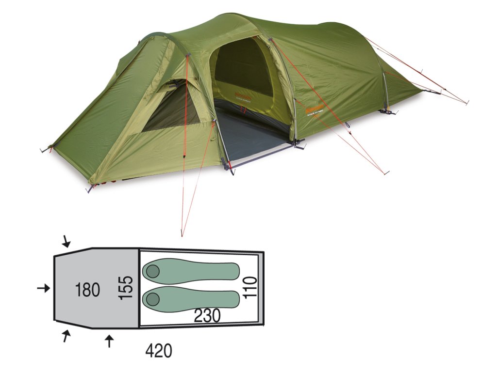 Velmi prostorný stan tunelového typu, vhodný i do horších povětrnostních podmínek, díky svému nízkému profilu.